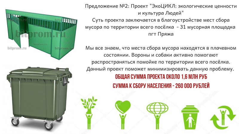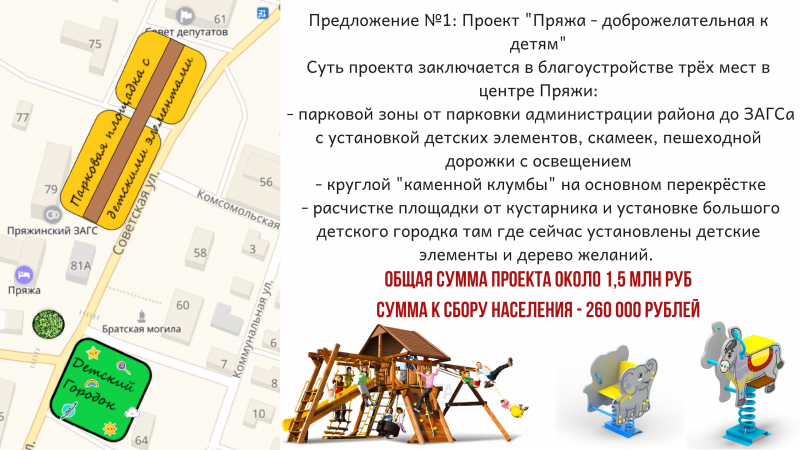 Есть два предложения по проектам, но это не значит, что нельзя предлагать свои варианты) На фото представлены две важные идеи, которые поднимались ранее на обсуждениях и общественных мероприятиях: комплексная детская площадка и тема мусора. Предлагаем Вам определиться, стоит ли Пряже в этом году подавать заявку и если да, то с каким проектом.